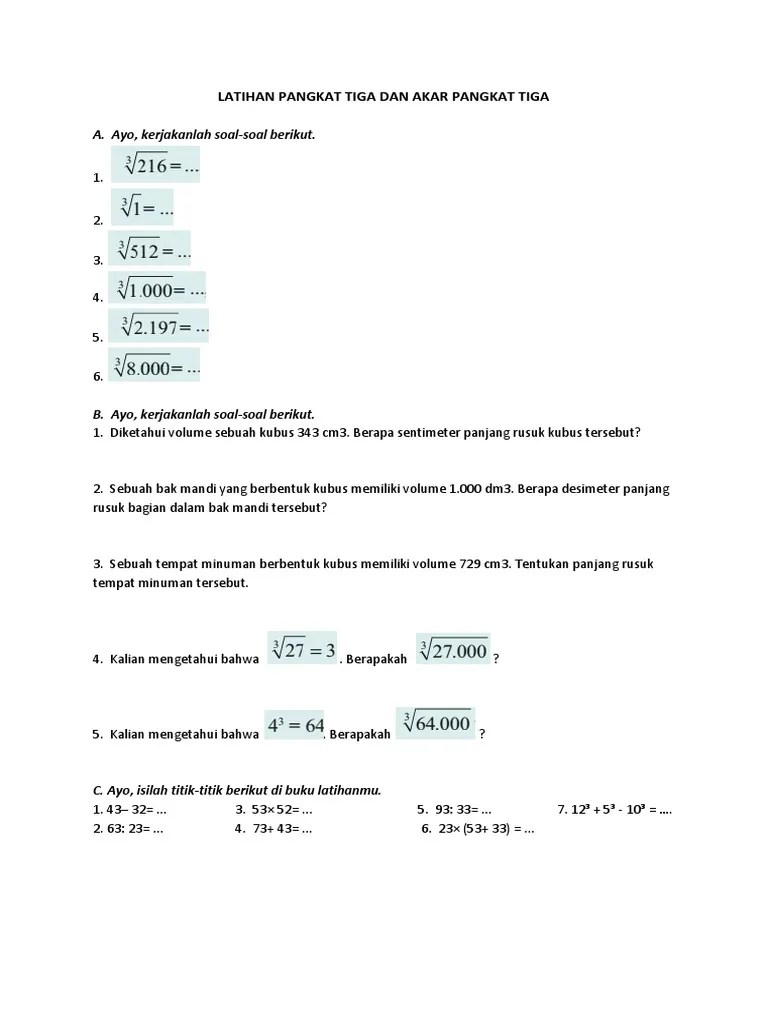 Soal latihan matematika kelas 5 akar pangkat 3.